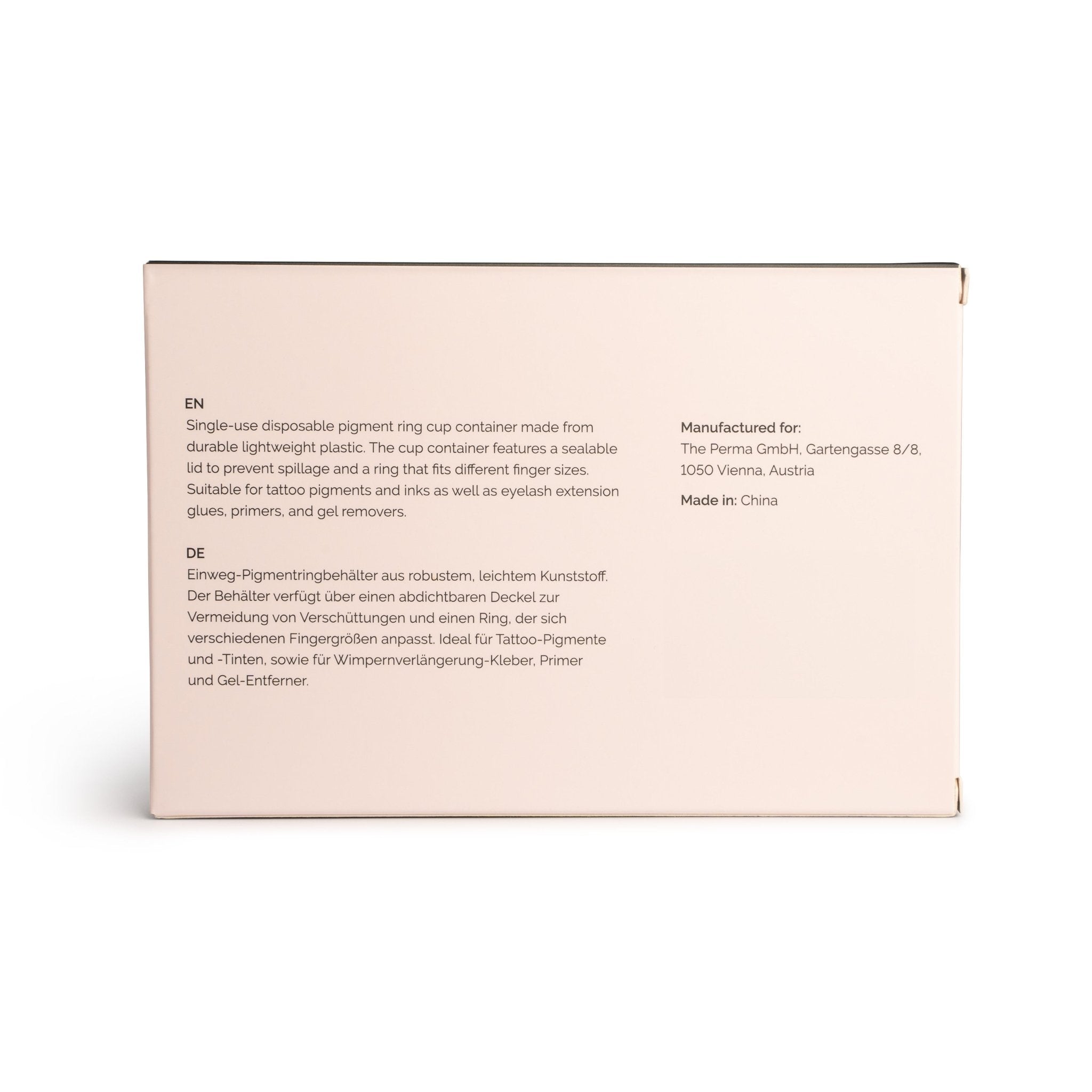 Einweg-Pigmentringbehälter aus robustem, leichtem Kunststoff.Der Behälter verfügt über einen abdichtbaren Deckel zur Vermeidung von Verschüttungen und einen Ring, der sich verschiedenen Fingergrößen anpasst. Ideal für Tattoo Pigmente und -Tinten, sowie für Wimpernverlängerung-Kleber, Primer und Gel-Entferner.